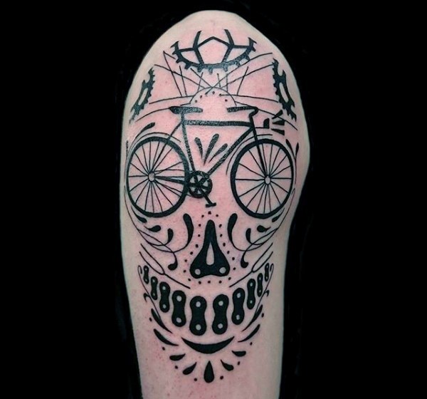 大臂黑色线条自行车与零件纹身图案