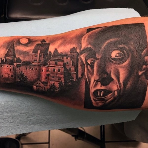 手臂原始黑灰吸血鬼城堡纹身图案