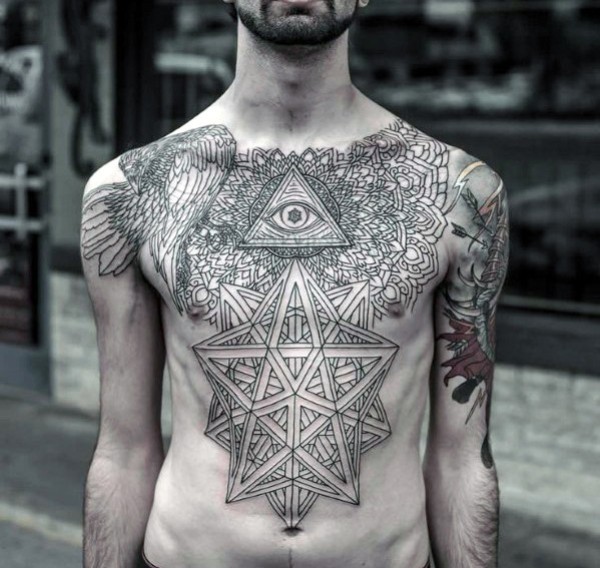 胸部华丽的黑色线条梵花五角星眼睛纹身图案
