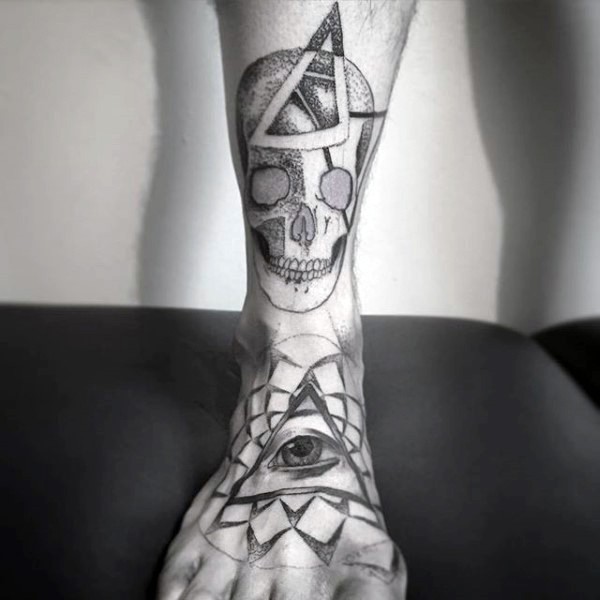 小腿黑色点刺骷髅与脚背眼睛纹身图案