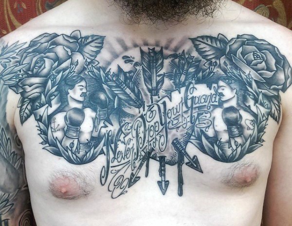 胸部old school黑色拳击手与花朵字母箭纹身图案