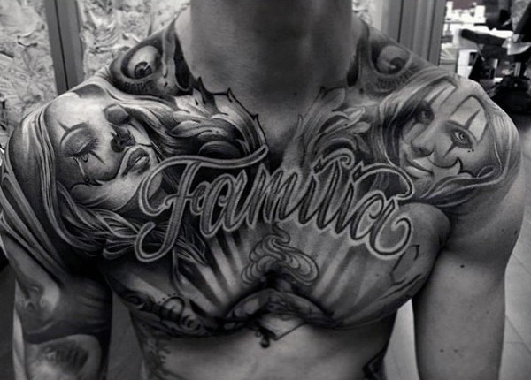 胸部黑灰字母与女性头像纹身图案