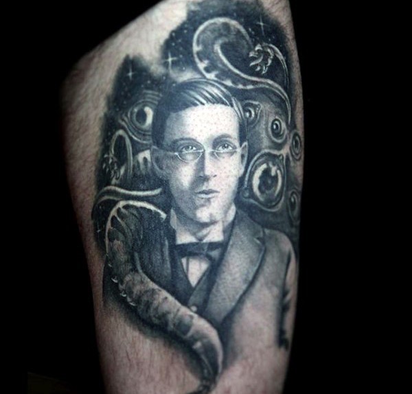 大腿黑白神秘男子肖像和章鱼纹身图案