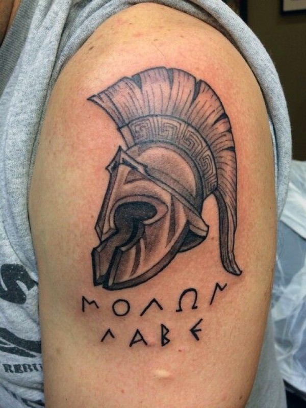 大臂old school字母与黑色罗马战士头盔纹身图案