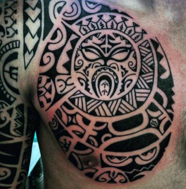 胸部令人印象深刻的黑色部落风格图腾纹身图案