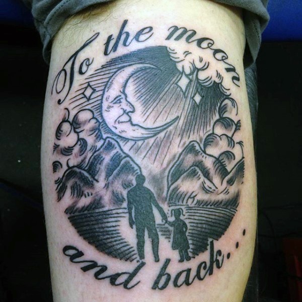 纪念式黑白父女人像和月亮字母纹身图案
