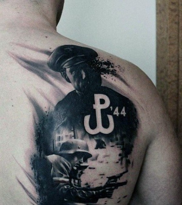 背部写实的世界大战士兵黑白纹身图案