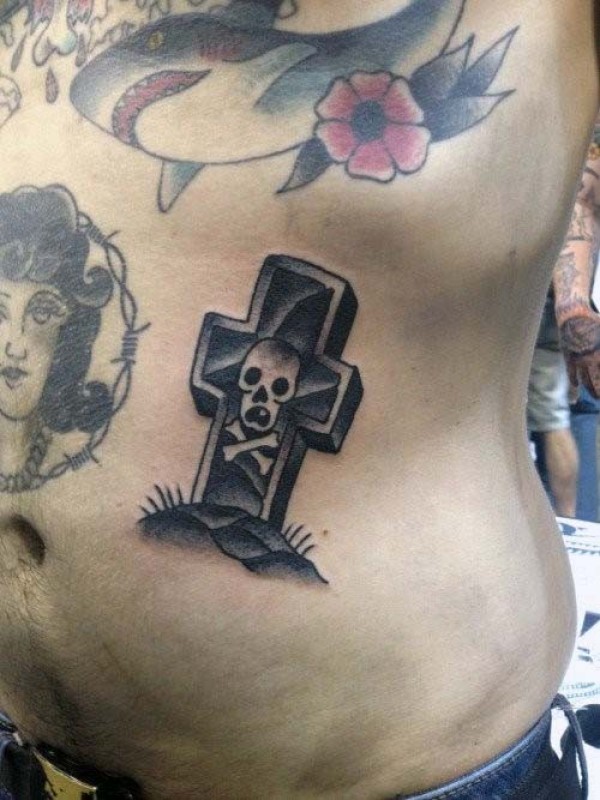 侧肋old school黑灰十字架墓碑骷髅纹身图案