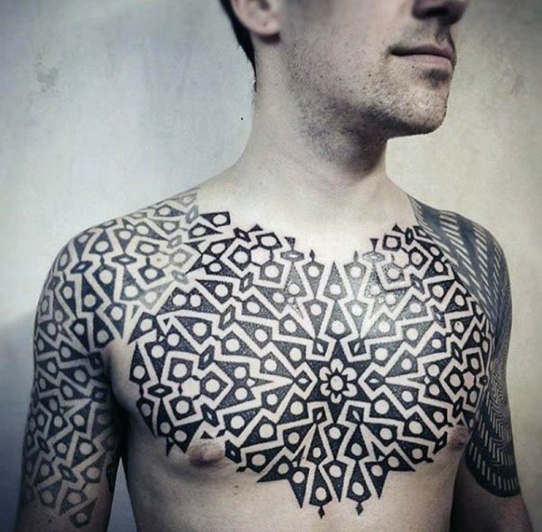 胸部和肩部黑白几何装饰纹身图案