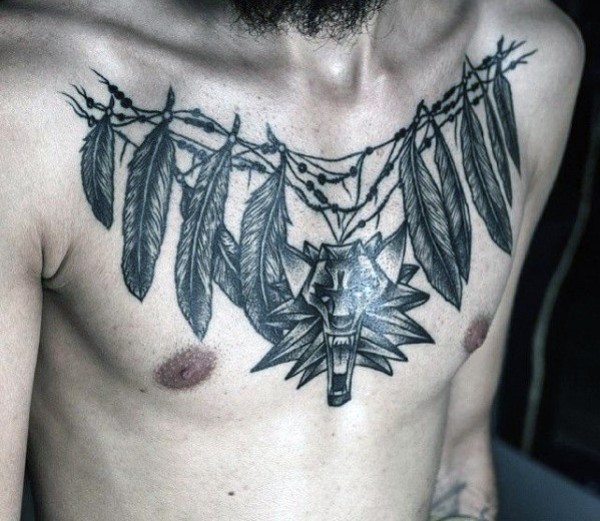 胸部恐怖的黑色神秘羽毛项链纹身图案