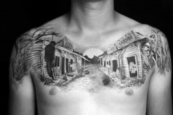 胸部写实黑灰西部小镇风景纹身图案