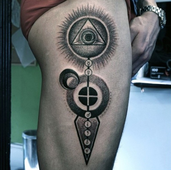 大腿黑色点刺神秘的几何符号眼睛纹身图案