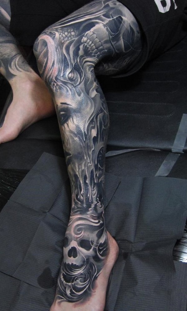 恐怖风格黑色幻想怪物骷髅腿部纹身图案