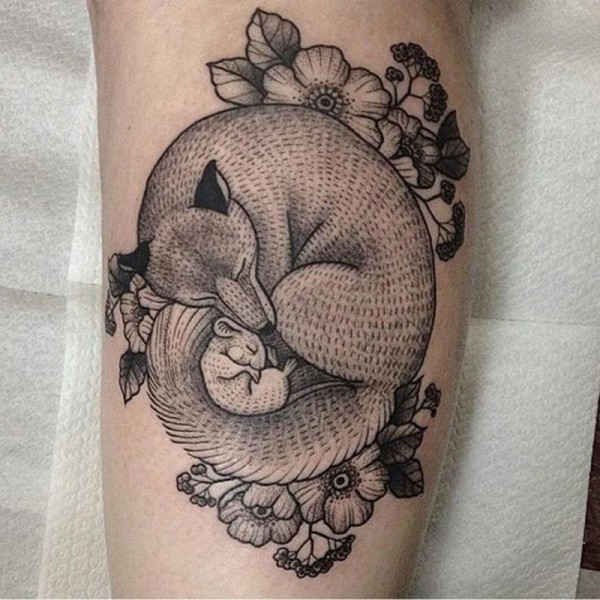 小腿黑色甜美的狐狸和小老鼠纹身图案