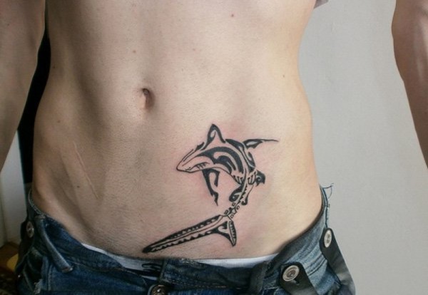 腰部部落风格黑色鲨鱼图腾纹身图案