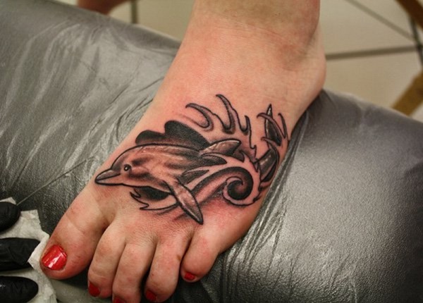 脚背简单的黑色海豚纹身图案