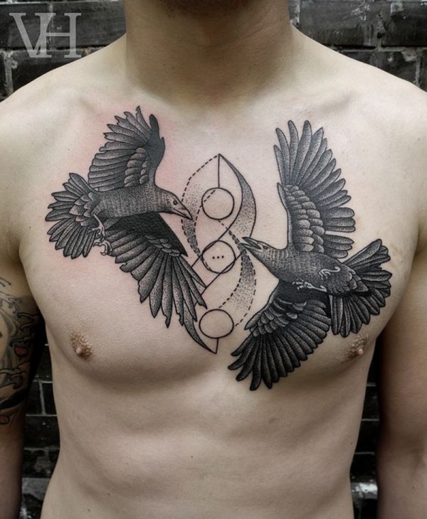 神秘风格黑色乌鸦胸部纹身图案