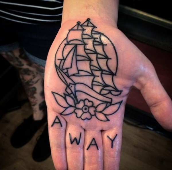 手心简约黑色线条帆船纹身图案