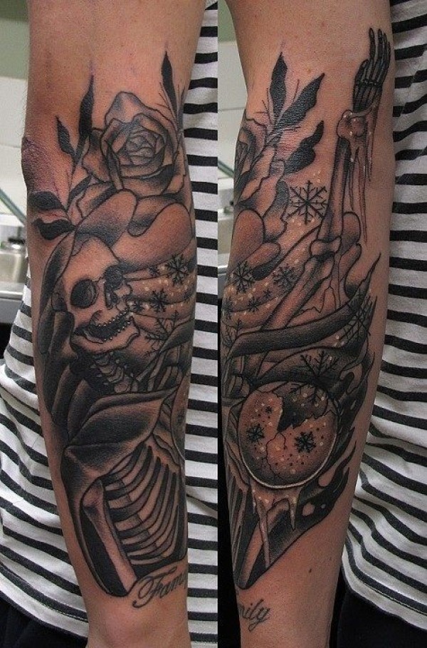 old school手臂黑色骷髅与玫瑰水晶球纹身图案