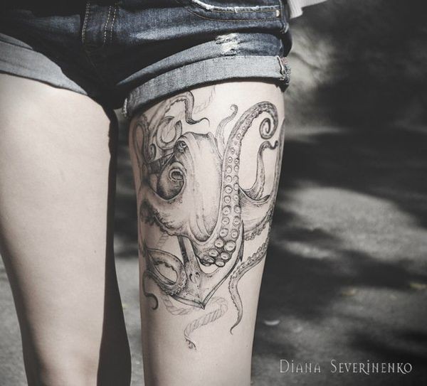 大腿精致的黑灰章鱼纹身图案