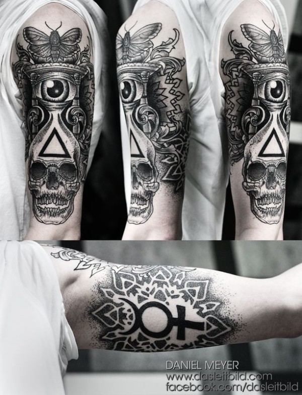 手臂黑白沙漏眼睛飞蛾骷髅纹身图案
