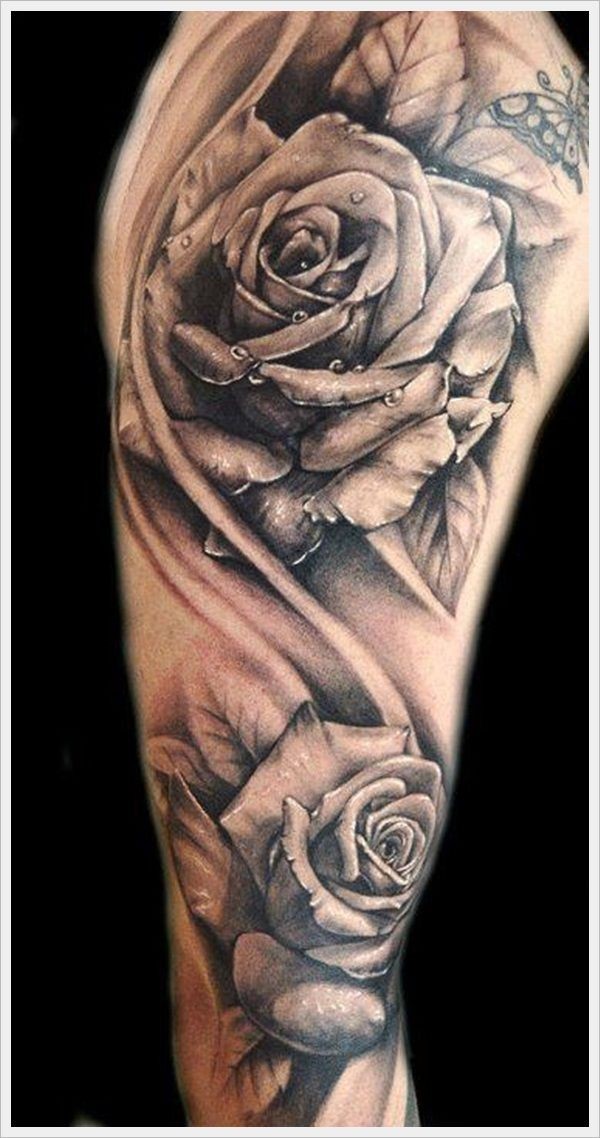令人惊叹的逼真黑灰玫瑰与水滴纹身图案