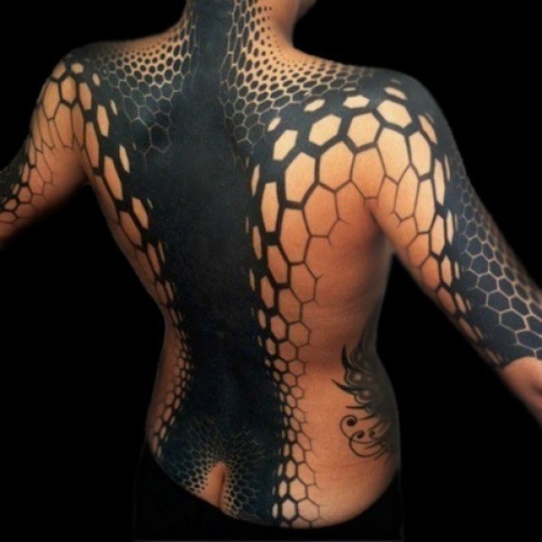 全甲夸张的黑色六边形组合纹身图案
