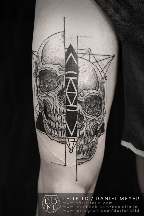 大腿黑色分裂骷髅与神秘的金字塔纹身图案