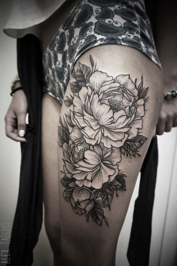 大腿经典黑色线条花卉纹身图案