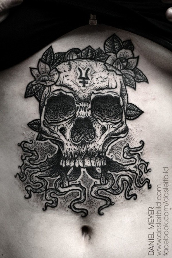 old school黑色点刺骷髅与符号花朵腹部纹身图案