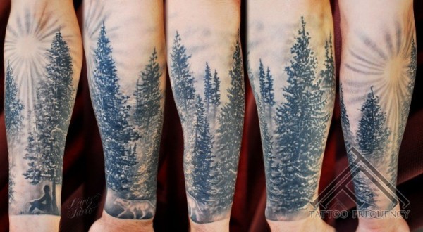 小臂非常逼真黑白清晨森林狼纹身图案