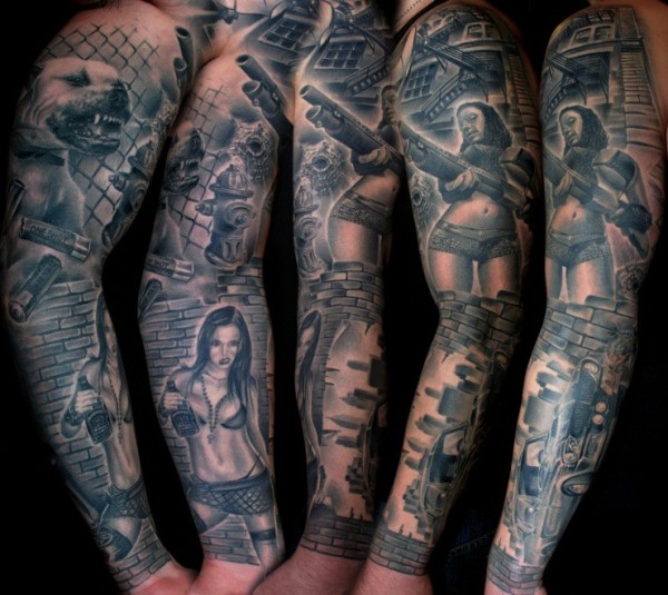 手臂黑白女性与狗纹身图案