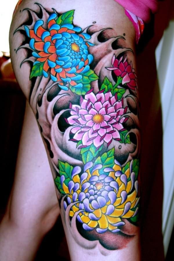 大腿彩色日式菊花纹身图案