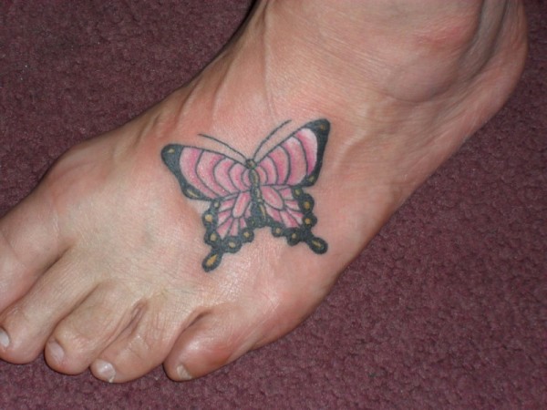 可爱的粉红色与黑色蝴蝶脚背纹身图案