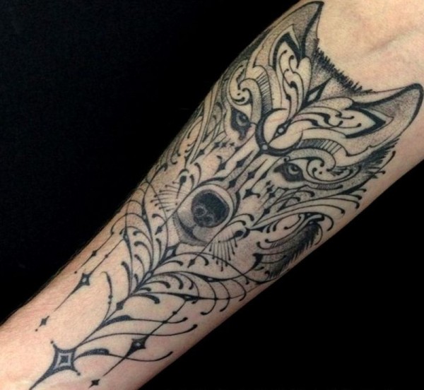 手臂黑灰藤蔓狼纹身图案