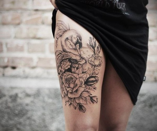 大腿黑灰色白天鹅和玫瑰纹身图案