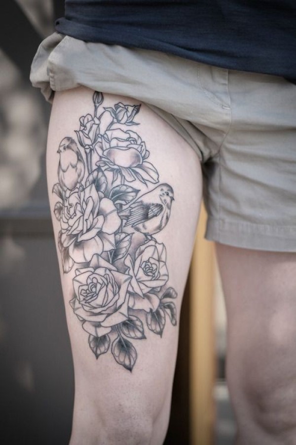黑色线条玫瑰与小鸟大腿纹身图案