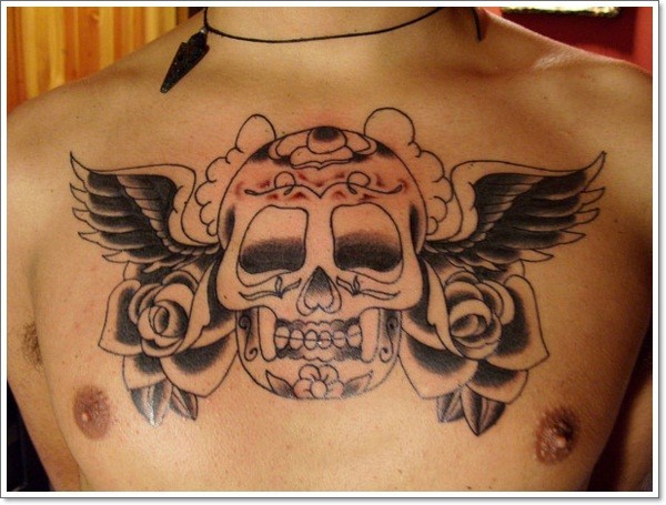 黑灰墨西哥骷髅与玫瑰胸部纹身图案
