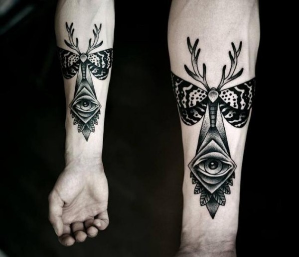 手臂黑灰点刺眼睛飞蛾鹿角纹身图案