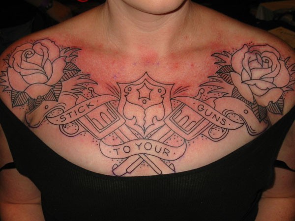 女孩胸部黑色手枪和玫瑰纹身图案