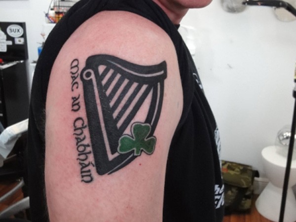 可爱的黑色竖琴与绿色三叶草大臂纹身图案