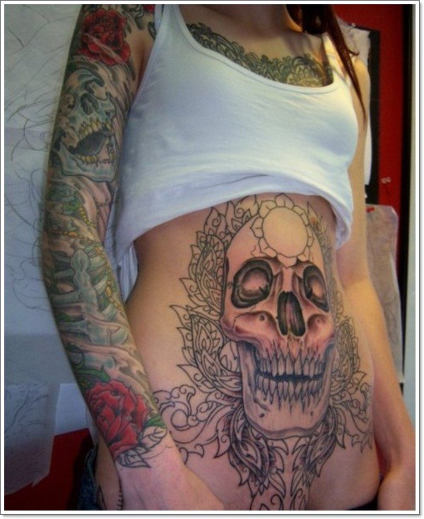 腹部黑色骷髅与梵花纹身图案