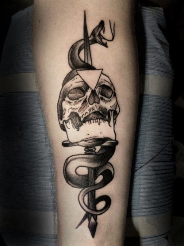 黑灰匕首刺穿骷髅和蛇纹身图案
