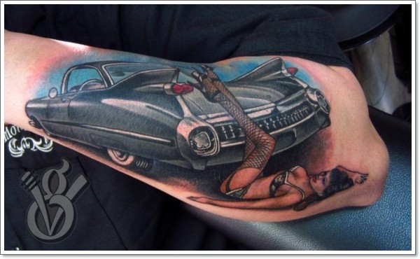 令人惊叹的黑色凯迪拉克汽车和女孩纹身图案