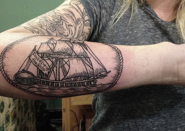 小臂黑色线条帆船纹身图案