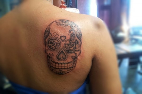 黑灰墨西哥骷髅背部纹身图案