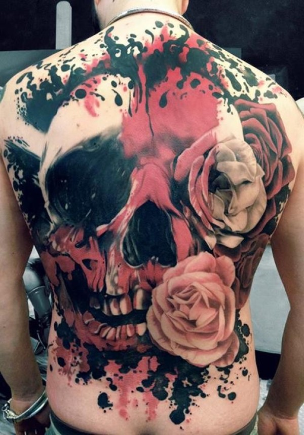满背黑色和红色骷髅玫瑰纹身图案