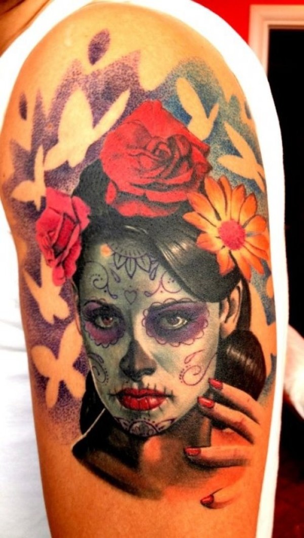 大臂鲜艳的死亡女郎与玫瑰纹身图案