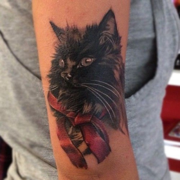 黑猫和红色的蝴蝶结手臂纹身图案