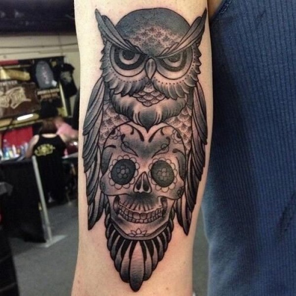 黑色猫头鹰与骷髅手臂纹身图案